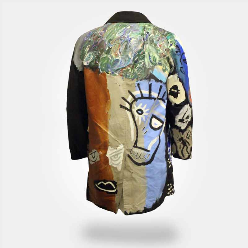 Customized hand painted rain coat by TelaModa artist, Tarik Mendes. Tarik creates paintings, drawings and sculptures. By emphasizing aesthetics, Mendes seduces the viewer into a world of ongoing equilibrium and the interval that articulates the good and the ugly of daily life. His paintings sometimes mimic ancient African and Egyptian culture mixed with contemporary themes. His works are notable for their textured finish and colorful nature. This is of great importance and bears witness to great craftsmanship. By applying abstraction, he considers making art a craft which is executed using clear formal rules and which should always refer to social reality.His works don’t always reference recognizable forms. The results are deconstructed to the extent that meaning is shifted and possible interpretation becomes multifaceted. Tarik Mendes currently lives and works in New York City.Tarik is a extremely talented artists and has created the most amazing hand painted bags and accessories for Telamoda. He is a very versatile artist and his hand painted wearable art pieces varies from bags to belts. | CUSTOMIZED HAND PAINTED RAIN COAT