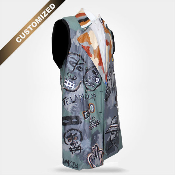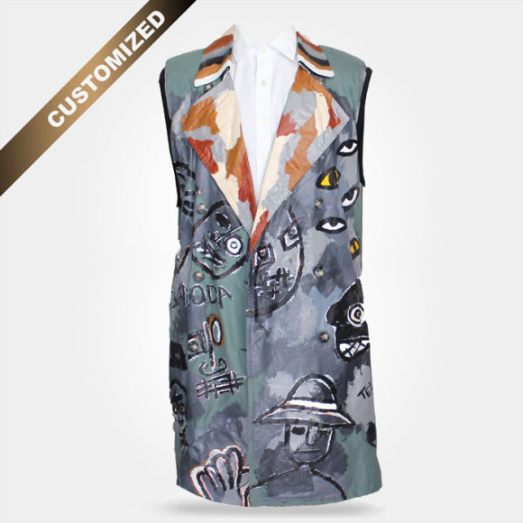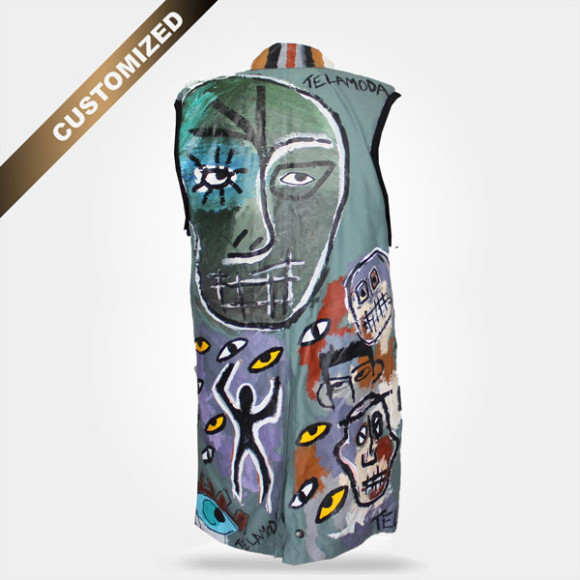 Customized hand painted rain coat by TelaModa artist, Tarik Mendes. Tarik creates paintings, drawings and sculptures. By emphasizing aesthetics, Mendes seduces the viewer into a world of ongoing equilibrium and the interval that articulates the good and the ugly of daily life. His paintings sometimes mimic ancient African and Egyptian culture mixed with contemporary themes. His works are notable for their textured finish and colorful nature. This is of great importance and bears witness to great craftsmanship. By applying abstraction, he considers making art a craft which is executed using clear formal rules and which should always refer to social reality.His works don’t always reference recognizable forms. The results are deconstructed to the extent that meaning is shifted and possible interpretation becomes multifaceted. Tarik Mendes currently lives and works in New York City.Tarik is a extremely talented artists and has created the most amazing hand painted bags and accessories for Telamoda. He is a very versatile artist and his hand painted wearable art pieces varies from bags to belts.