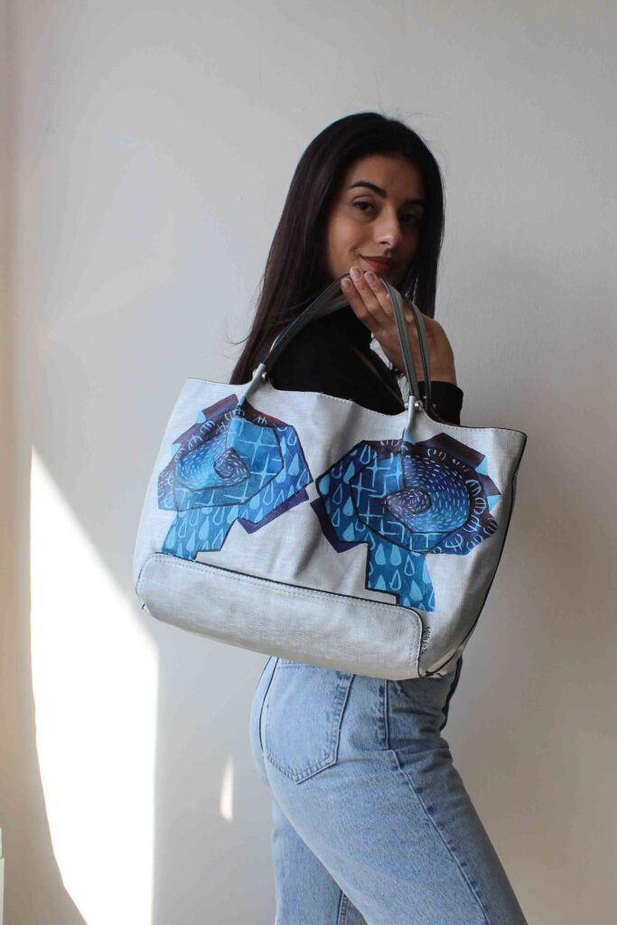 Acrylic Paint on leather bag and sealed with our special sealant
